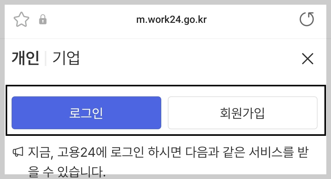10. 휴대폰으로 고용24홈페이지로 접속합니다. 우측상단 을 클릭=>개인 또는 기업로그인=> 공동인증서를 클릭합니다.
