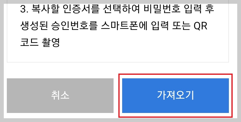 12. 순서9번에 있는 인증번호 12자리를 입력한후 가져오기를 클릭합니다.