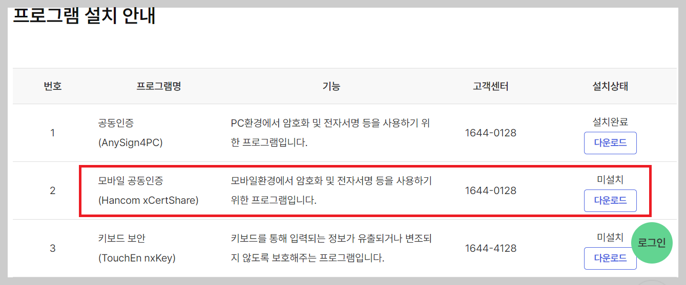 5. 프로그램설치안내에 따라 모바일 공동인증 프로그램을 다운로드진행합니다.
