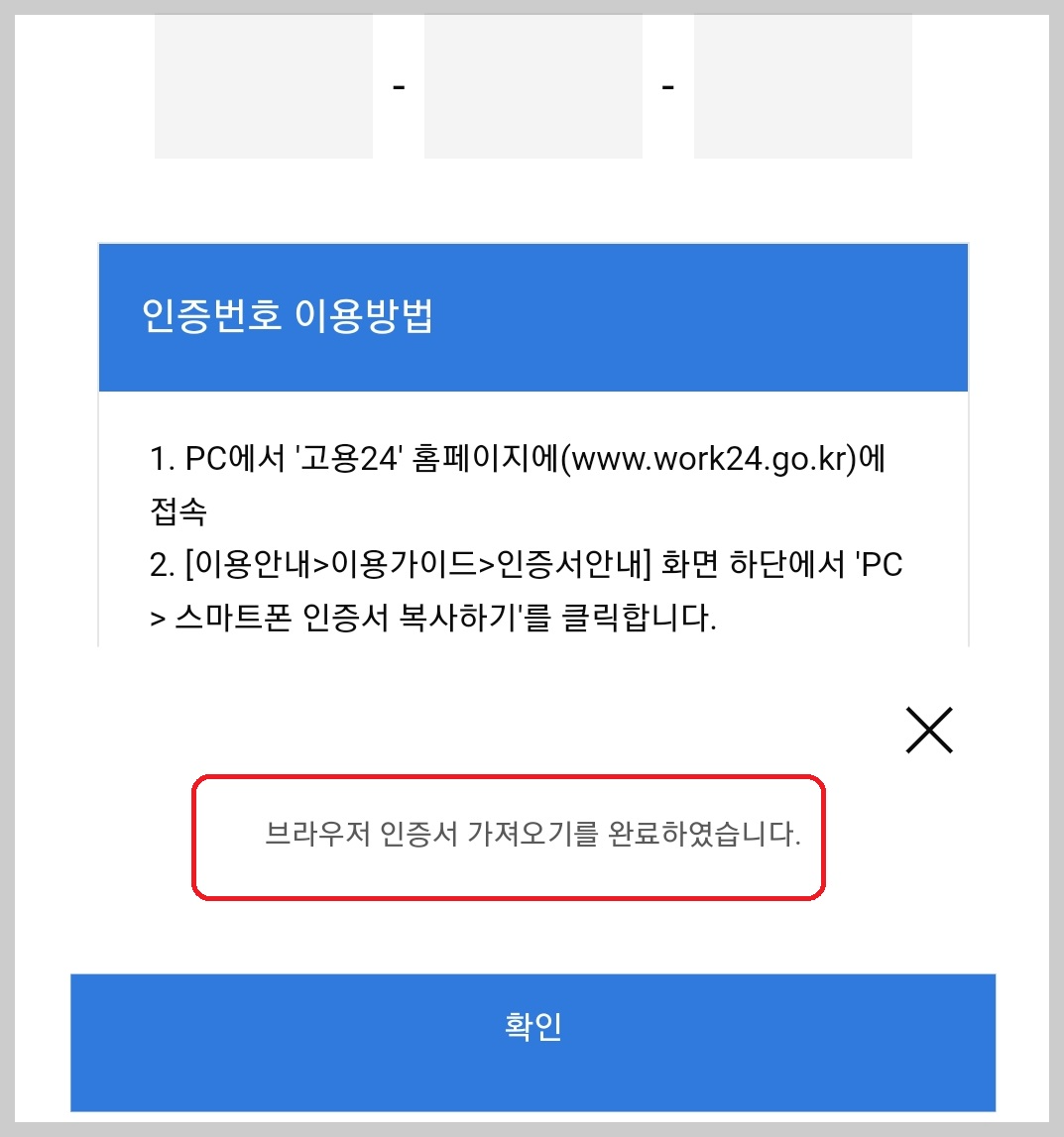 13. 인증이 완료되면 아래화면과 같이 "브로우저인증서 가져오기를 완료하였습니다." 메세지와 고용24홈페이지 로그인 진행시 아래와같이 휴대폰 인증서방에 복사한 공동인증서가 존재합니다.