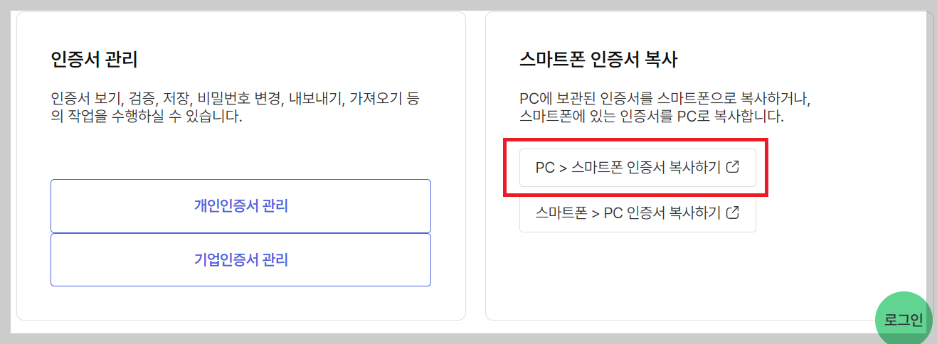 7. 프로그램이 설치가 완료되었다면 다시 인증서 이용안내 페이지에서 아래로 내려 PC>스마트폰 인증서 복사하기를 클릭합니다.