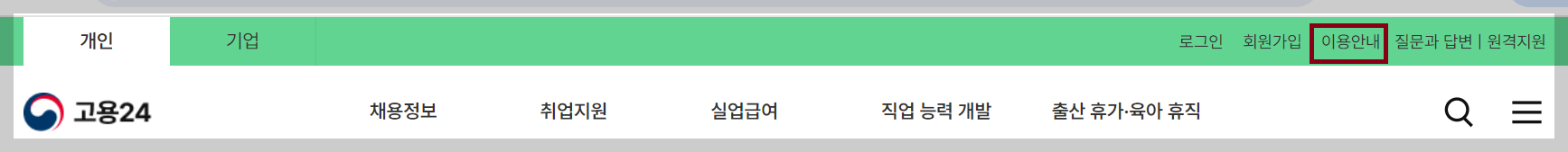 2. 고용24홈페이지 우측상단 이용안내를 클릭하니다.