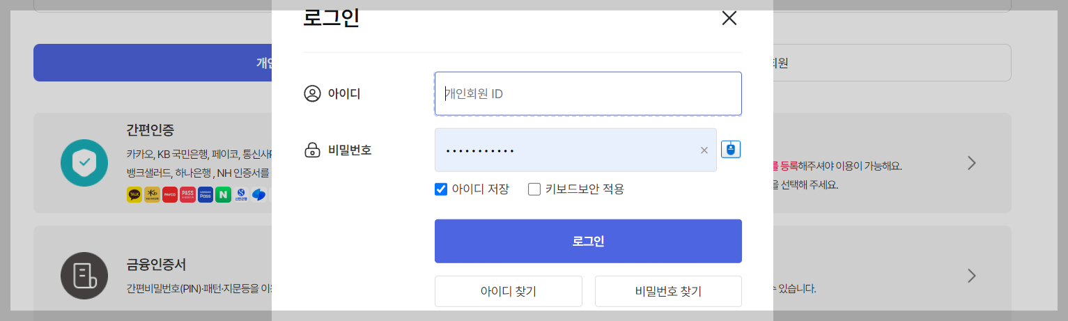 3. 로그인방법중 아이디및 비밀번호로 로그인을 진행합니다.