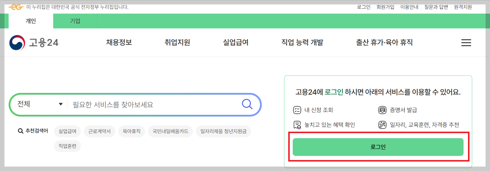 2. 고용24 홈페이지 로그인을 진행합니다.