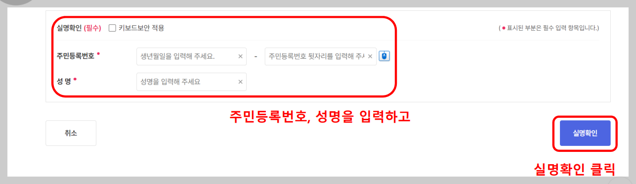 5. 실명인증선택하여 진행합니다.(주민등록번호와 성명을 입력하고 실명확인 버튼을 클릭합니다.)