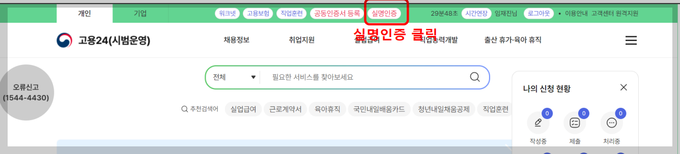 4.고용24 홈페이지 상단부 실명인증을 클릭합니다.(상단부에 실명인증이 보이지 않는분은 실명인증이 완료된 회원입니다.)