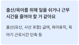 ○ 출산 휴가·육아 휴직 메뉴에서는 ①출산전후(유산·사산·배우자)휴가 급여 신청, ②육아휴직급여 신청 등 이용 가능