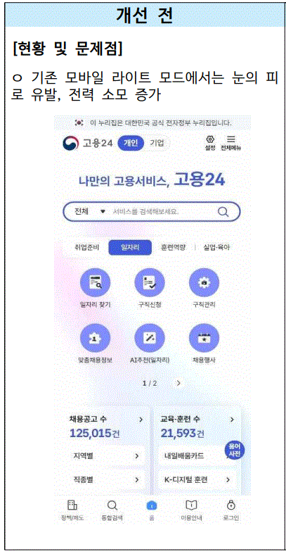 고용24 모바일 서비스는 구직자와 기업, 국민 모두가 일자리 정보를 손쉽게 확인할 수 있도록 운영되고 있으나, 기존 모바일 환경에서는 라이트 모드만 제공되어 장시간 이용 시 눈의 피로를 유발한다는 지적이 있었다. 특히 야간이나 어두운 환경에서 화면 밝기가 과도하게 느껴져 이용 불편이 발생했고, 화면 밝기로 인한 배터리 소모 역시 문제로 제기되었다. 이러한 사용자 불편을 해소하기 위해 모바일 화면 개선이 추진되었다.