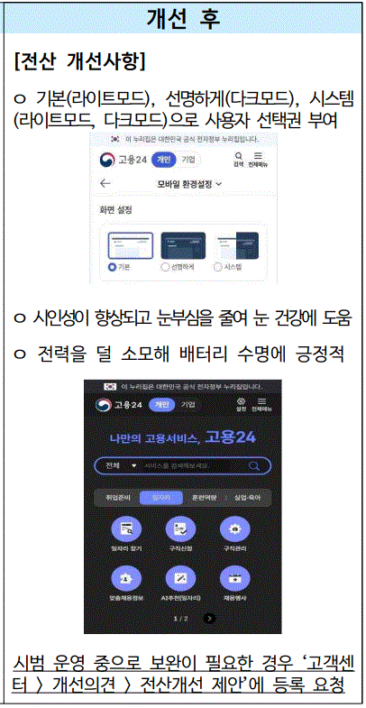 이번 다크모드 적용은 시범 운영 단계로 진행되고 있으며, 실제 이용 과정에서 발견되는 불편 사항이나 개선 필요 요소는 지속적으로 보완될 예정이다. 이용자는 고용24 모바일 내 ‘고객센터 > 개선의견 > 전산개선 제안’ 메뉴를 통해 의견을 등록할 수 있으며, 이를 바탕으로 서비스 품질이 점진적으로 개선될 계획이다.