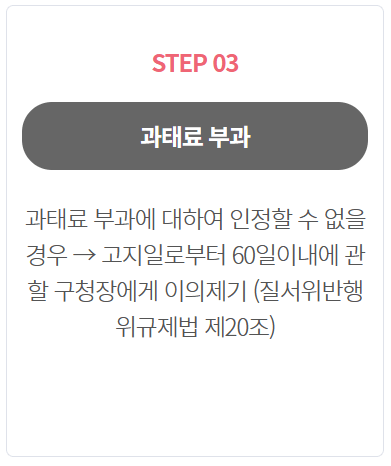 「도로교통법」상 주차위반에 대한 과태료 부과 : 차가 주차금지 구역에 주차되어 그 위반 사실이 사진·비디오테이프나 그 밖의 영상기록 매체에 의해 입증된 경우 차량의 소유주 등은 6만 원 이하의 과태료를 부과 받습니다.