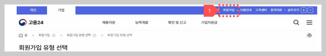 1. 홈페이지 메뉴상단 회원가입 선택후 기업회원가입을 선택합니다.