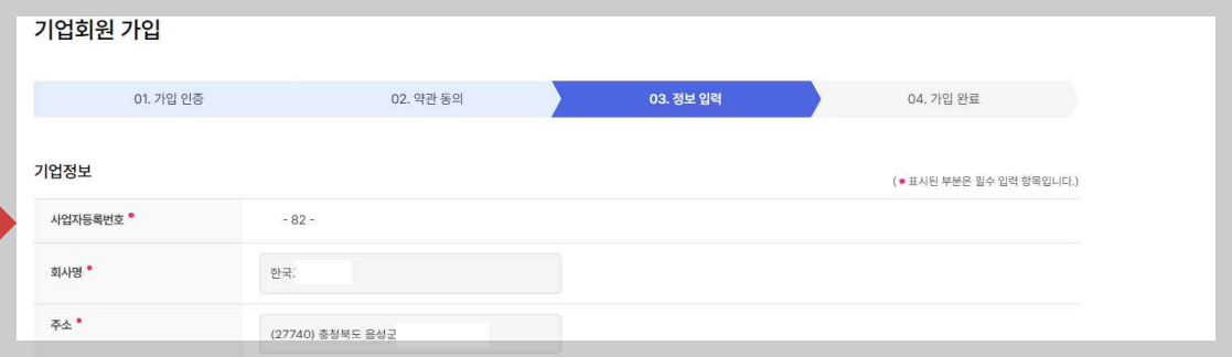 5. 국세청에 등록된 사업자등록증 기준으로 사업자등록번호,회사명,주소,대표자명,개업일,사업자일반전화정보,업종 등록등 필수 입력 정보사항에대해 입력을 진행합니다.