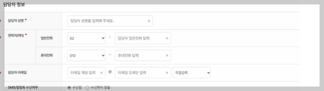 6.담당자정보입력시 기업대표담당자 성명과 연락처는 필수입력입력이며기업대표 담당자 이메일입력과 이메일 수신여부등을 체크합니다.