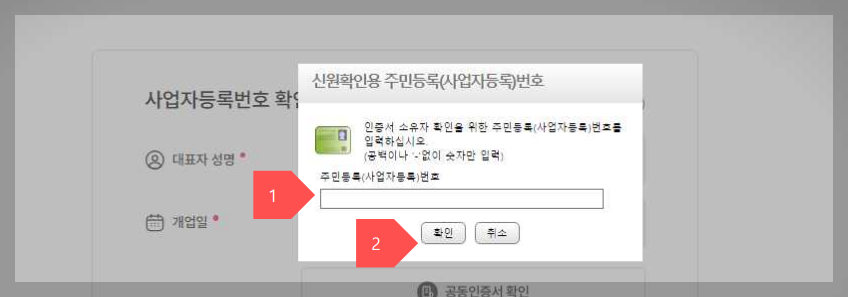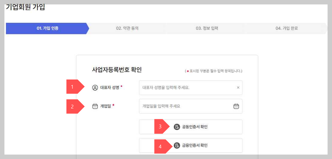 3. 국세청에 등록된 사업자 등록증 기준으로 성명과 개업일자를 필수 입력 하시고 회원가입하려는 상업자 등록번호로 발급급받은 공동인증서또는 금융인증서를 확인을 선택하여 기업인증을 진행합니다. 인증서가 없는경우는 인증서발급받기 탭을 선택하여 인증서를 발급 받습니다.