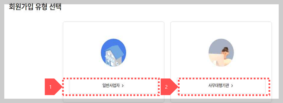 2. 기업회원중 개인사업자와 법인사업자일 경우에 일반사업자를 클릭하며 사무대행기관일경우에는 사무대행기관을 선택합니다.