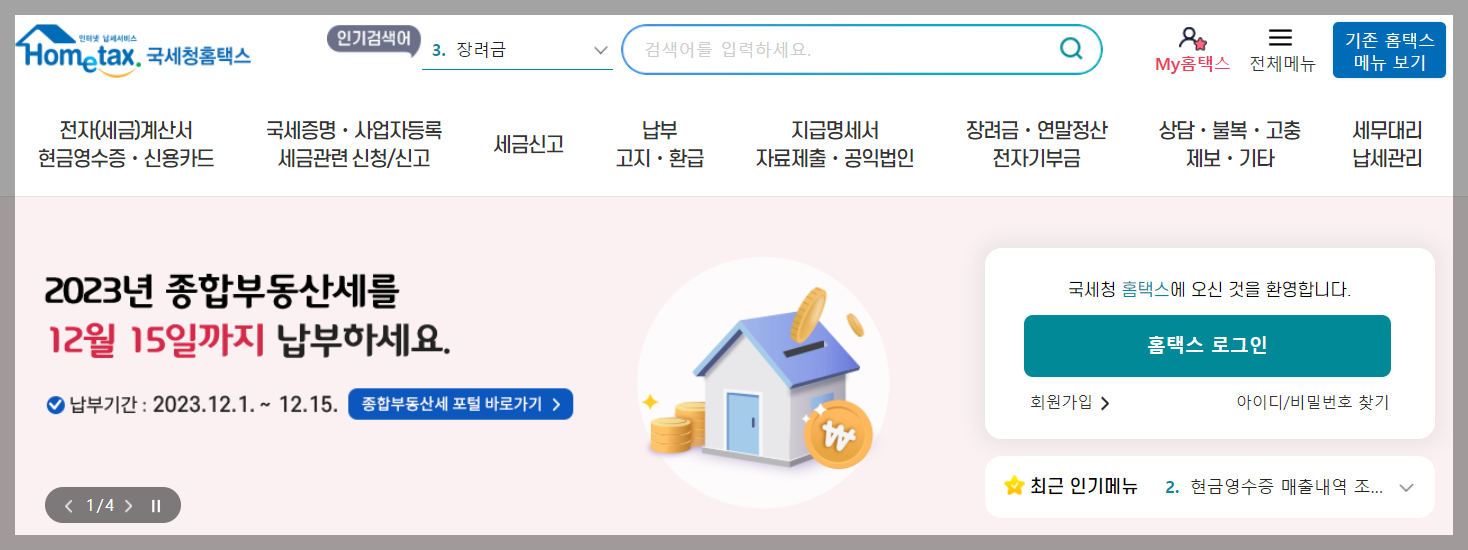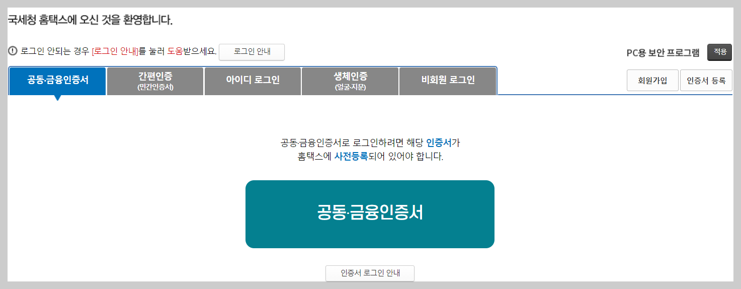 ① 먼저 국세청 홈택스에 접속합니다. 국세청 홈택스 접속시 제가 준비한 국세청 홈택스 위 링크를 통해 로그인 하시것나 포털사이트에서 국세청 홈택스 검색 한 후 접속하여 로그인하시길 바랍니다.