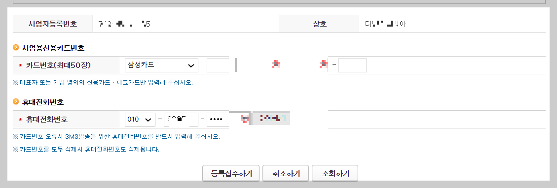 ⑤ 회사명과 사업자등록번호를 확인한후 개인신용카드번호를 입력진행합니다.
