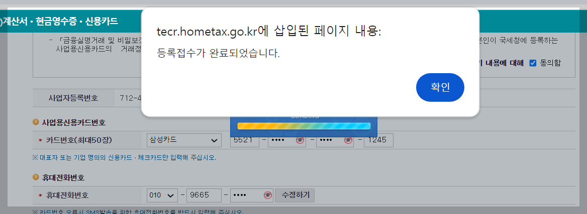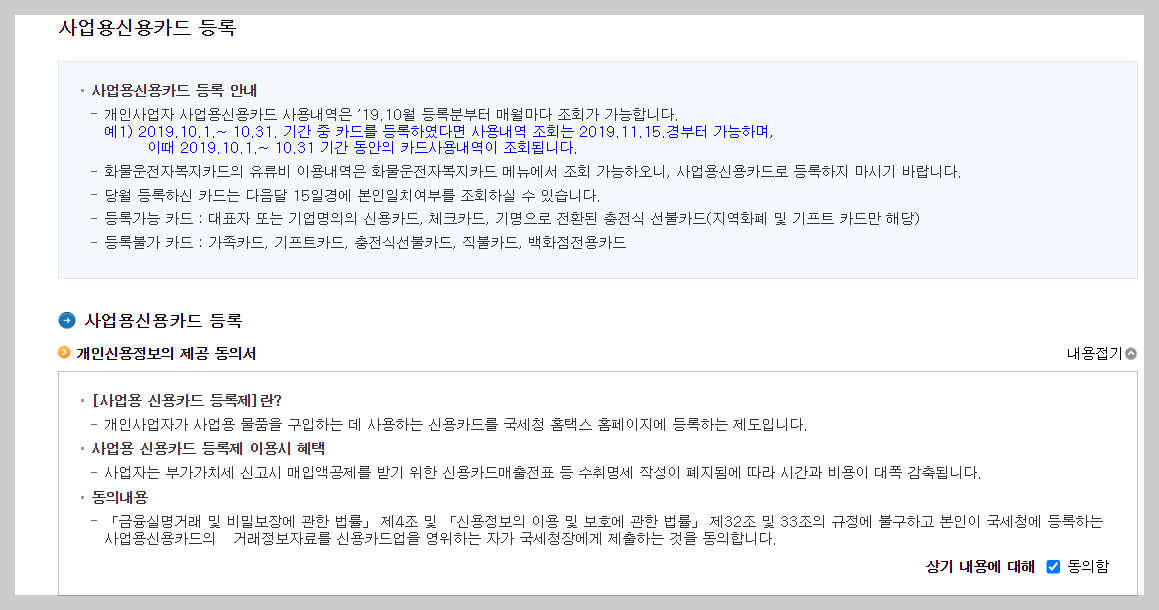 ④ 사업용신용카드 등록에 서 개인정보 제공동의서 동의함 체크를 진행합니다.