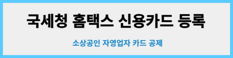 소상공인 및 자영업자 사장님들! 정말로 정말로 사업하기 힘든 시절입니다. 매일 매일 살 얼음판 걷는 심정으로 하루하루를 버텨나가시는 사장님들! 매출은 점점 줄어드는데 나가는 공과금은 한 결같이 똑 같으니 죽은맛이 이런 맛이라고 요즘 느끼고 있습니다. 한푼이라도 아끼려고 노력하시는 사장님들 ! 내 개인 신용카드를 홈택스 신용카드 등록 등록하여 한푼의 세금이라도 아껴보세요. 또한재발급 된 신용카드도 홈택스 신용카드 등록하셔야합니다. 아래 홈택스 신용카드 등록 방법에 대한내용을 확인하시고 바로 제가 준비한 홈텍스 홈페이지 링크통해 바로 홈택스 신용카드 등록하여 빠져나가는 세금을 한푼이라도 아껴보시기 바랍니다. 홈택스 신용카드 등록하기 어렵지 않습니다. 홈택스 신용카드 등록방법 매우 쉽게 가능합니다.