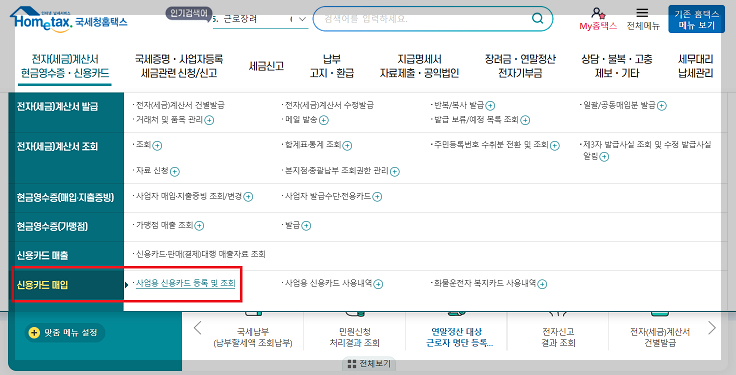 (국세청 홈택스 로그인후 신용카드 등록하기)