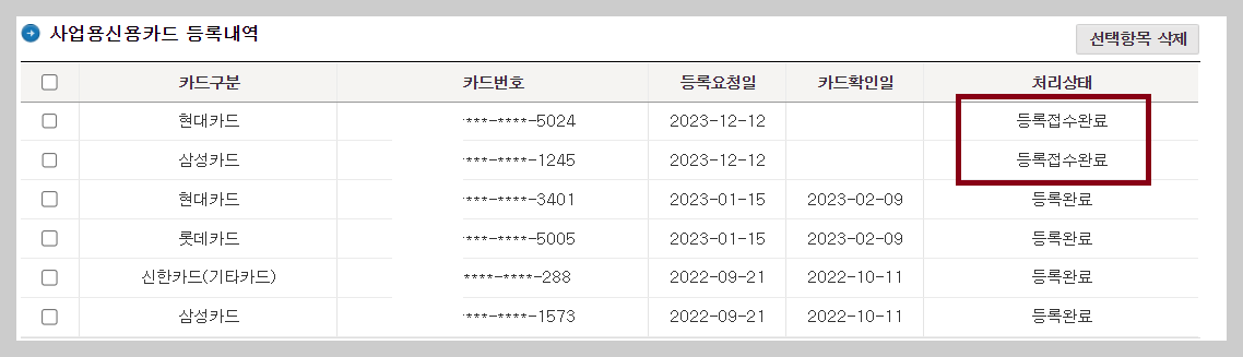 ⑥ 신용카드번호를 등록한후 등록접수하기를 클릭하면 등록접수가 완료되었습니다.
