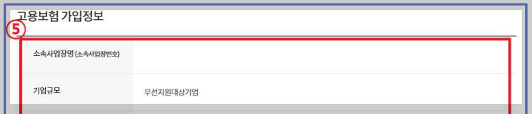 ⑤ 근로자의 경우, ‘소속 사업자명’,‘기업 규모’,‘상시 근로자수’, ‘취득일’,‘퇴사일’,‘근무일수’정보를 확인 할 수 있습니다.