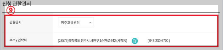 ⑨ 국민내일배움카드를 발급할 관할관서가 자동으로 지정됩니다. 자택주소를 기반으로 자동 지정되며 변경을 원하시는 경우 ‘▼’를 이용하여 변경 할 수 있습니다.