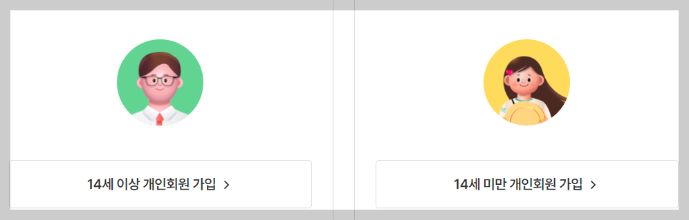 2.14세 이상 회원과 14세 미만 회원 중 본인의 연령에 해당하는 유형을 선택 하십시요. 14세 미만 회원의 경우 법정대리인 동의 절차가 진행됩니다.