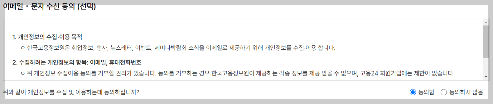 4. 개인회원약관동의및 개인정보 수집이용동의필수 동의체크및 이메일 문자수신동의 (선택)