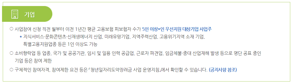 청년도약장려금사업 참여 신청은 직전 월부터 이전 1년간 평균 고용보험 피보험자 수(이하 “기준 피보험자 수”) 5인이상을 고용하고 있는 우선지원 대상기업의 사업주입니다. 다만, 기준 피보험자 수가 1인 이상 5인 미만인 기업이라도 다음의 어느 하나에 해당하는 기업은 지원 가능합니다.