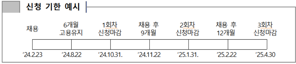 (신청 기한) 청년을 채용하고 최소고용유지기간(6개월)이 종료된 후, 익월부터 산정하여 2개월 이내 1회차 지원금을 신청하여야 하며 이후 2, 3회차 지원금은 3개월 단위로 신청하되, 각각 채용일로부터 9개월, 12개월이 되는 날이 속한 달의 익월부터 2개월 이내에 신청하여야 합니다. 더 많은 정보를 원하는 기업주는 아래 링크통해 2024 청년일자리도약장려금 사업운영 지침서을 다운받아 자세히 확인하시기 바랍니다.