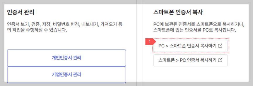 휴대폰에서 고용24에 접속하신 다음 로그인 > 공동인증서를 선택하신다음 하단의 가져오기 버튼을 클릭하시기 바랍니다. 그 이후 PC에서 고용24에 접속하신 다음 공동인증서 사용 안내 메뉴(또는 고용24에 로그인하신 다음 마이페이지 > 회원정보관리 > 회원 인증서 관리 메뉴)에서 PC > 스마트폰 인증서 복사하기를 눌러 내보내시면 됩니다. 공동인증서 복사하는 방법은 아래 인증서 다운로드 방법을 통해 확인하시기 바랍니다.