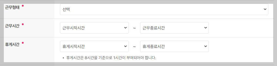 4. 근로자의 근무형태와 휴게시간을 명확히 정보를 입력합니다.