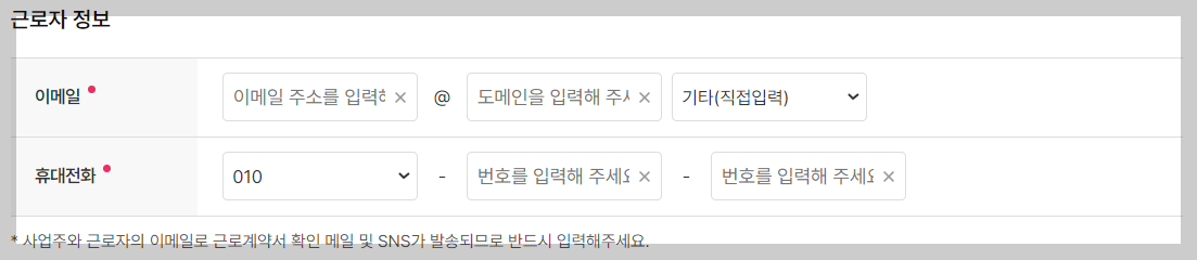 1.고용24 홈페이지 전자 근로계약서 작성시 먼저 기업주와 근로자의 확인을 위한 정보를 입력합니다.
