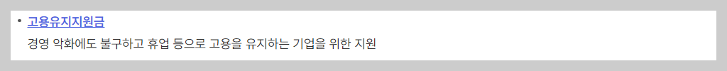 사업주가 사업규모의 축소 등으로 상용 근로자의 고용조정이 불가피하게 된 기업주에게 상용근로자를 퇴사시키지 않고 계속 근로자를 고용 유지 할수 있도록 근로자에게 지불되는 비용의 일부를 지원하는 제도입니다. 기업은 고용유지지원금을 지원받기 위해서는 사업주가 근로자에게 지원기준에 맞는 고용유지조치를 진행하여야 하며, 현재 고용유지조치는 ‘휴직’ 또는 ‘휴업’이 있습니다.