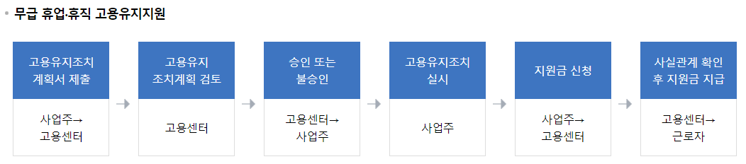 무급 고용유지지원금의 경우 무급 휴업·휴직을 실시하기 30일 전까지 사전요건을 갖추어 무급 휴업·휴직 고용유지계획 신청서와 관련 서류를 제출해야 하며, 이후 고용유지조치계획에 대한 승인을 받은 경우에 한하여 지원금 지원이 가능합니다