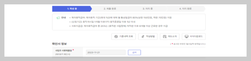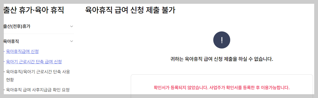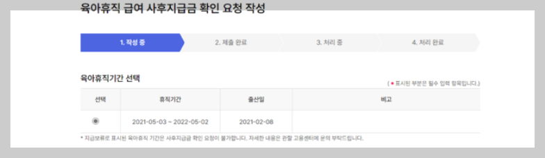 4). 개인이 고용24에서 육아휴직급여를 신청전 사업주가 육아휴직 확인서를 고용센터에 제출하셔야 계속진행할 수 있습니다.