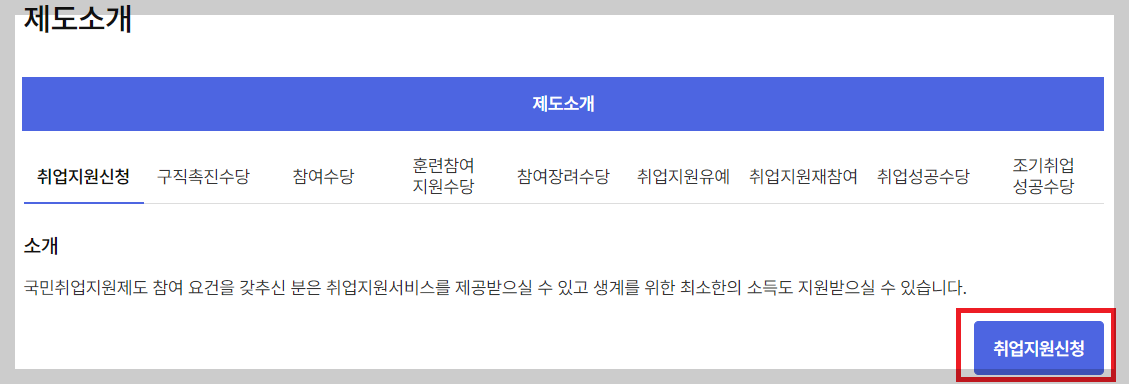 국민 취업지원제도는 일은 하고 싶으나 사회 활동을 하지못해 경제적 상황이 정부가 정하는 일정 수준 이하이거나, 취업 준비에 어려움을 겪고 있는 사람(취약계층, 저소득층, 청년)이면 대부분 참여할 수 있는제도로 이미 일을 하고 있거나 다른 지원을 받고 있는 등 심사관이 판단하여 국민취업지원제도를 통해 지원할 필요성이 없는 사람은 제외됩니다, 국민취업지원 제도는 취업을 원하는 참여자에게 1:1 상담, 직업훈련, 일경험 등 다양한 지원을 통합적으로 제공하여 취업에 성공할 수 있도록 돕는 제도이며 또한 국민취업지원제도에 참여하는 기간 중 생계 부담을 덜 수 있도록 고용복지플러스센터에서 관련 취업지원서비스와 수당(비용)을 지원해드립니다. 고용보험에 미 가입한 된 국민도 참여할 수 있습니다. 아래 고용24홈페이지에서 참여신청을 진행할 수 있으니 참여 방법에 대한 내용을 확인하시고 국민취업지원제도 참여신청을 진행하시기 바랍니다.