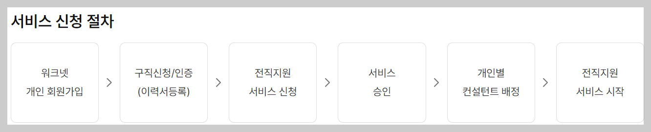 중장년내일센터의 서비스 신청은 본인만 가능하며 서비스 신청 진행은 고용24 개인회원가입 → 구직신청(이력서 등록) 및 인증 → 중장년내일센터 서비스신청 → 중장년내일센터 컨설턴트 배정 → 세부 서비스 시작 [고용24 회원가입 바로가기]로 신청할 수 있습니다. 고용24 회원가입시 휴대폰 본인 간편인증으로 회원가입이 진행하오니 이점 유의바랍니다.