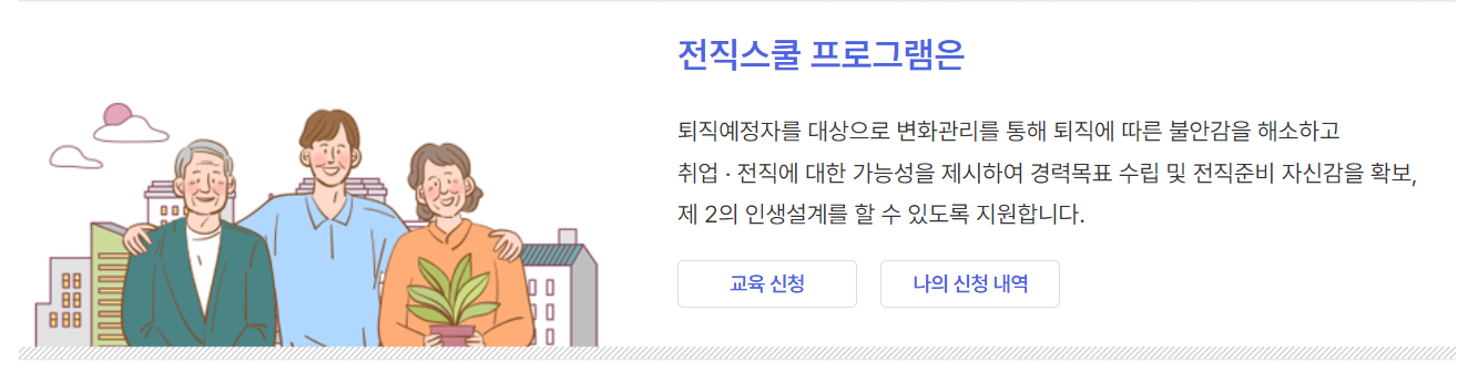 전직스쿨 프로그램은 전직을 준비하는 중장년을 대상으로 하는 지원 프로그램으로 재직중인 퇴직중장년을 대상으로 퇴직에 따른 불안감을 해소하고 취업ㆍ전직에 대한 가능성을 제시하여 이직에 대한 불안감을 해소하고 경력목표 수립하여 퇴직후 제 2의 인생설계를 할 수 있도록 지원합니다.