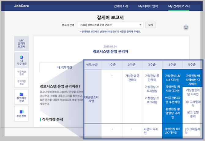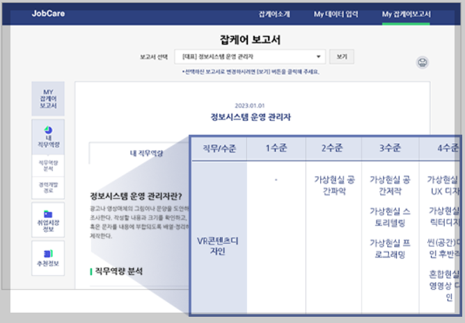 STEP3.선택한 직종으로 간편 보고서 생성하기 잡케어가 분석한 보고서를 통해 나의 직무역량 수준파악부터 앞으로의 경력개발경로 설계까지 한번에~