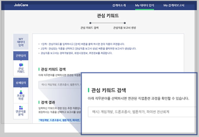 간편검색의 “관심 키워드 검색”을 클릭하고 전공이나 자격증, 훈련과정, 직업, 기술 등 관련 키워드를 입력하면 잡케어가 관련 직종을 추천하고, 추천직종 중 하나를 선택하면 주요업무 등 해당 직종에 대한 설명과 경력개발경로, 취업시장정보, 추천정보를 제공합니다. 간편입력 보고서는 경험 또는 경력이 부족하거나 직종 중심의 진로 및 취업시장 정보를 활용하여 직업설계가 필요한 사용자에게 도움이 될 수 있습니다.