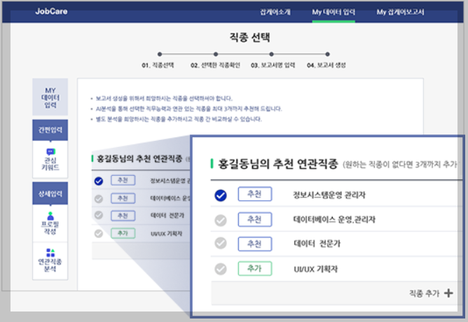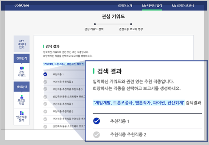 STEP2.검색된 직종 분석 하기관심키워드를 통해 추천된 직종을 분석해서 잡케어 보고서를생성해 보세요.