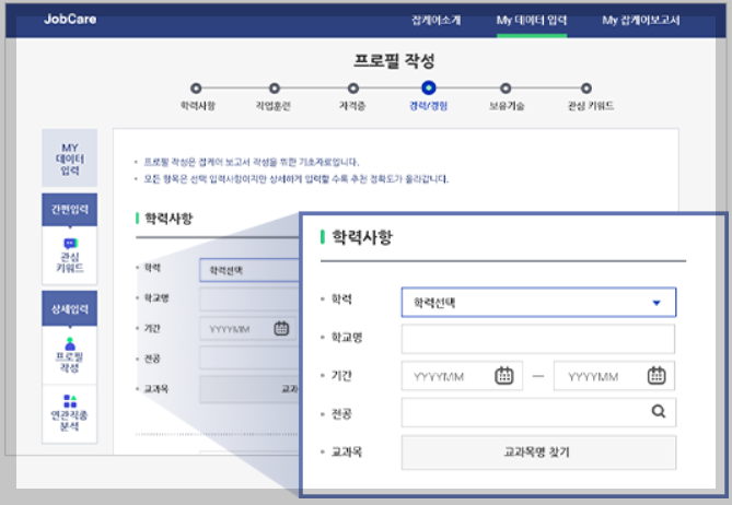 STEP1. 잡케어의 시작은 프로필 작성 부터나의 진로 관리를 위해 경험한 이력을 프로필에 작성해 주세요.