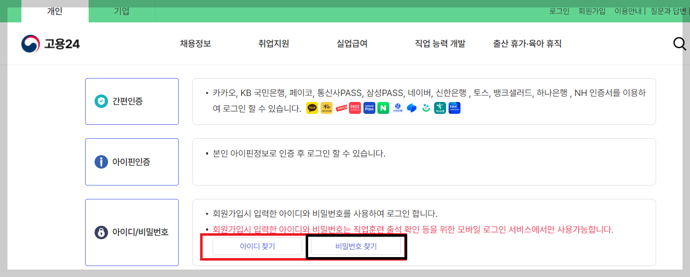 앞에서 언급 한 것처럼 고용24 로그인 방법은 다섯가지 방법이 있으며 아이디와 비밀번호로 진행 이용은 직업훈련 출석 확인 등을 위한 모바일 로그인 서비스에서만 사용가능합니다. 일때 회원가입시 입력한 아이디와 비밀번호를 사용하여 로그인 합니다. 그 외에 고용24 로그인은 공동인증서, 아이핀번호, 휴대폰간편인증, 금융인증서로 고용24 홈페이지에 로그인 진행 할 수 있습니다.