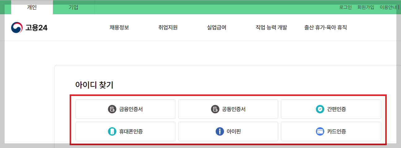 2). 고용24 아이디찾기위한 인증방법을 선택합니다.