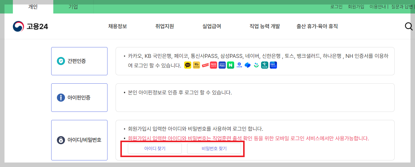 회원가입후 고용24 홈페이지 로그인 방법은 금융인증서 로그인, 휴대폰간편인증 로그인 , 공동인증서로그인, 아이핀 인증으로 로그인 진행할수 있습니다. 고용24 아이디및 비밀번호 로그인선택은 직업훈련 출석 확인 등을 위한 모바일 로그인 서비스에서만 사용가능함으로 만약에 아이디및 비밀번호 분실로 찾고자 할 때에는 아래 링크를 통해 고용24 아이디와 비밀번호찾기를 진행하시기 바랍니다.