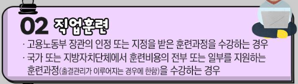 | 직업훈련 | -근로자직업훈련촉진법 제 28조의 규정에 의하여 고용노동부 장관의 인정 또는 지정을 받은 훈련과정을 수강하는 경우 -국가 또는 지방자치단체에서 훈련비용의 전부 또는 일부를 지원하는 훈련과정 (출결관리가 이루어지는 경우에 한함)을 수강하는 경 |