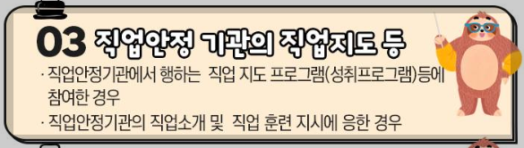 -직업안정기관에서 행하는 직업 지도 프로그램(성취프로그램)등에 참여한 경우 -직업안정기관의 장이 소개한 사회 봉사 활동에 참여하는 경우 -직업안정기관의 직업소개 및 직업 훈련 지시에 응한 경우 |