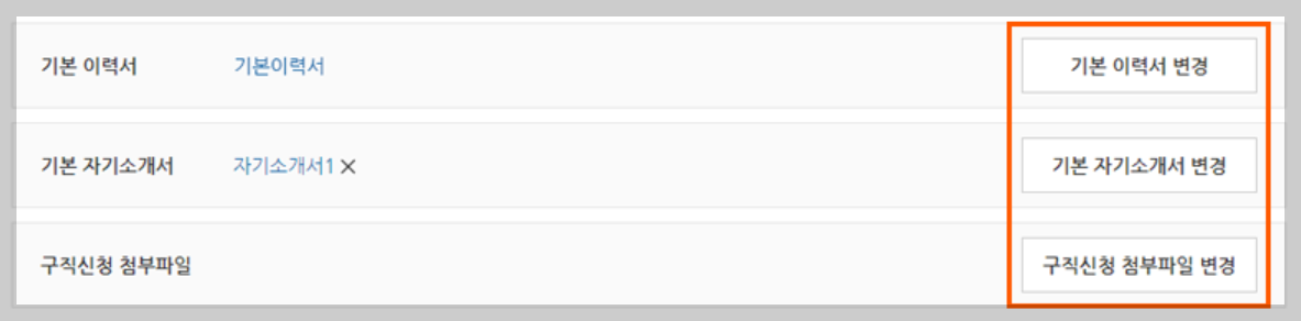 6. 기존의 기본이력서 또는 자기소개서를 변경하고자 한다면 변경으로 이동하여 수정또는새로운 이력서를 작성합니다.